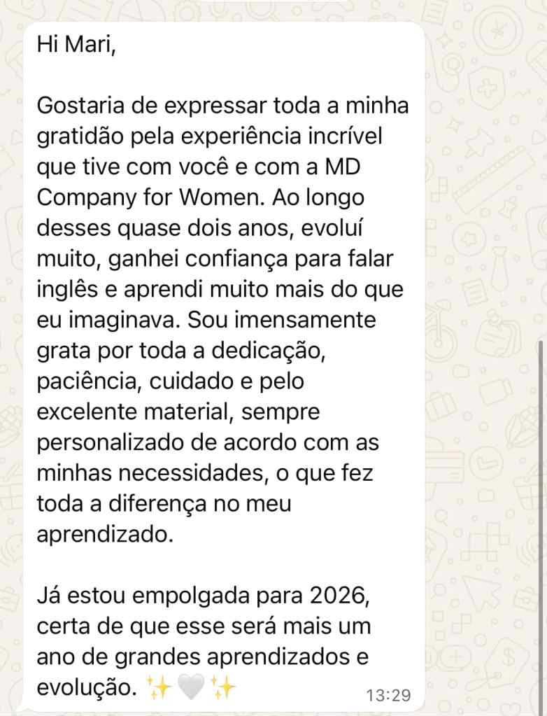 Antes de ensinar mulheres a saírem do limbo do intermediário, eu precisei entender esse lugar na prática. Eu já estive ali: estudando, me comunicando, mas sem sentir domínio real. Foi essa vivência que me permitiu criar um método que não ignora o que acontece no meio do caminho.