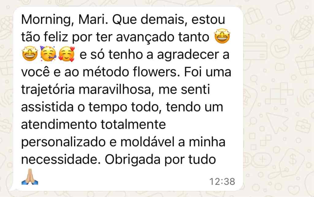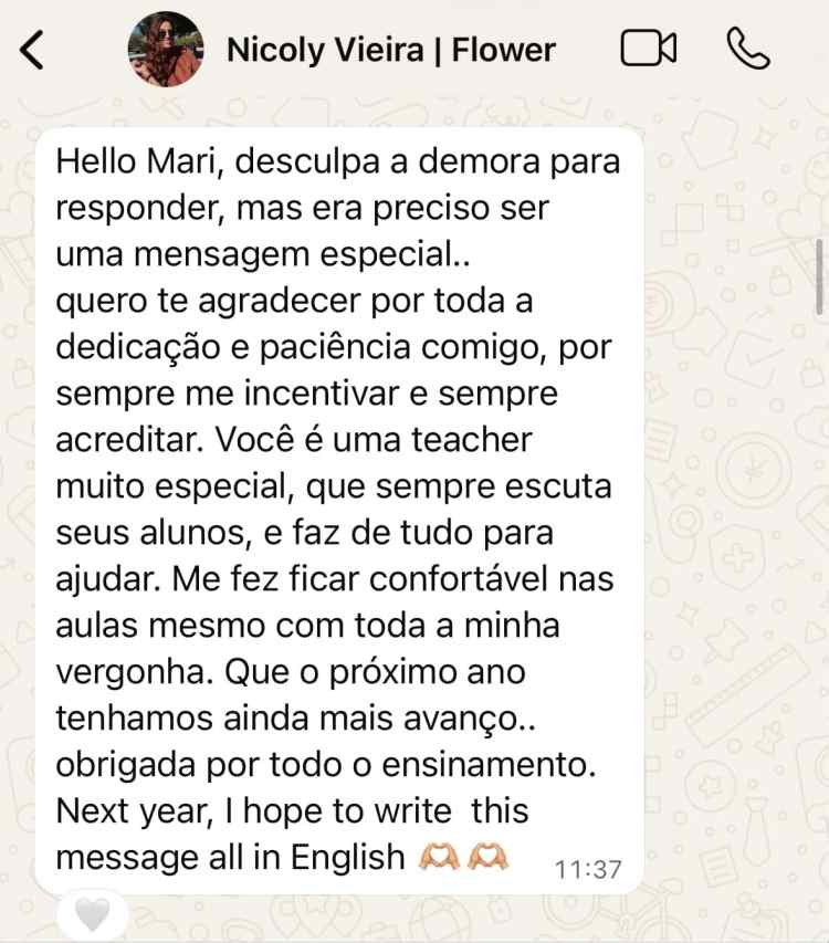 O Método Flower não é mais um curso, é uma mentoria para ter direcionamento estratégico, clareza sobre o seu nível e prática real de conversação, tudo adaptado à sua rotina, aos seus objetivos e às suas travas específicas.