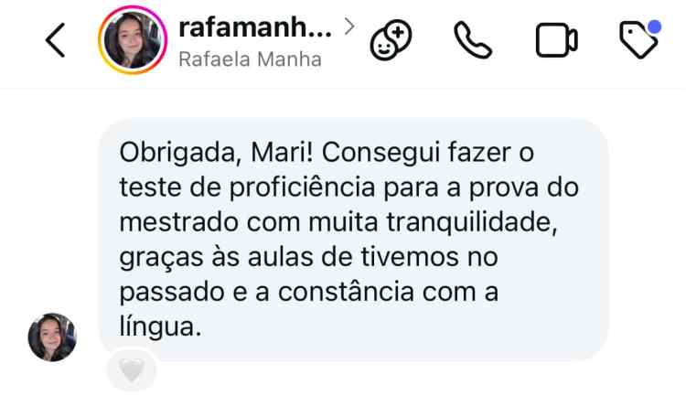 Todo direcionamento, encontros individuais e o plano é ajustado à sua realidade atual, assim como foi para fazer com que a Rafaela alcançasse a fluência em 1 ano com uma rotina e um plano alinhado aos seus objetivos.