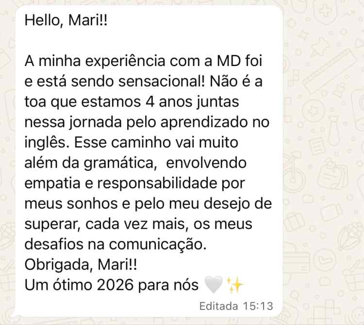 Você é acompanhada de perto para sair do ponto em que está hoje e avançar com segurança rumo a um nível mais alto de fluência, assim como a Letícia que hoje se tornou confiante para se comunicar e se expressar em inglês.