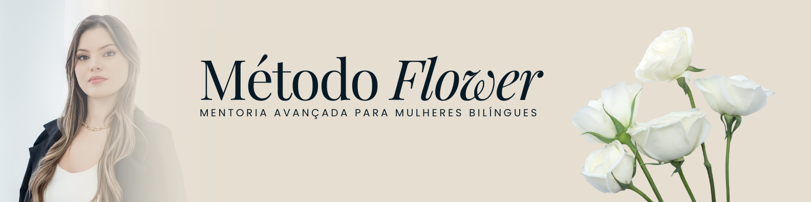 O Método Flower é uma mentoria individual de inglês para mulheres que já têm base no idioma, mas querem falar com mais confiança e fluidez. Eu acompanho você de perto, com prática real, direcionamento personalizado e foco na sua evolução até um nível mais avançado de inglês de forma leve, possível e conectada à sua rotina.