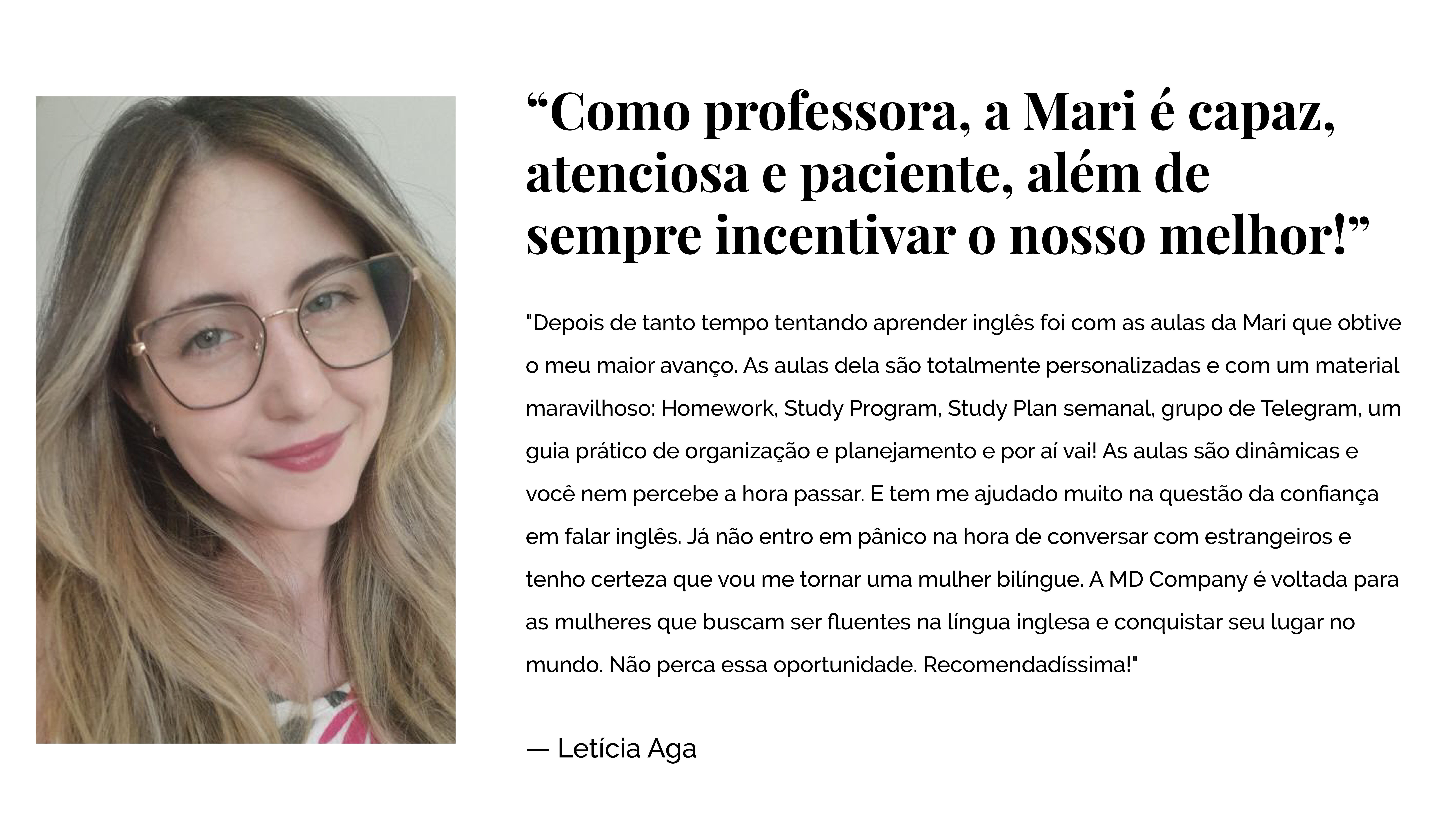 A MD Company for Women é uma escola e comunidade digital de ensino de inglês para mulheres que, por meio de educação, metodologia autoral, conteúdo, cursos, aulas, treinamentos e mentorias incentiva, promove e direciona mulheres a conquistarem seus espaços no mundo através do inglês.