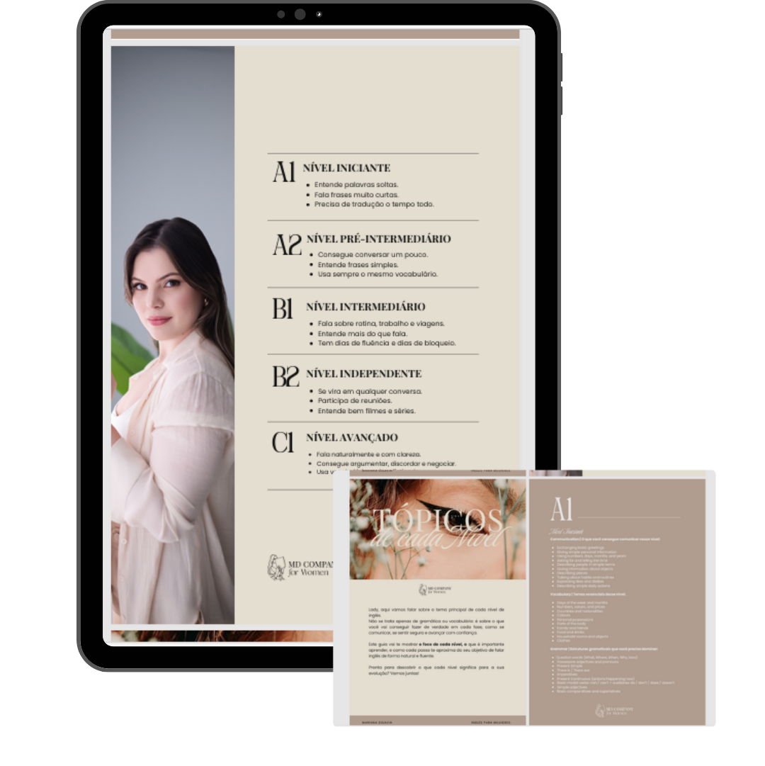 É onde você para de perder tempo e começa a praticar inglês do jeito certo. Tudo é organizado por nível, com materiais escolhidos para gerar evolução real. Você sabe exatamente o que usar, como praticar e onde focar. Sem excesso, sem confusão, só clareza, direção e constância.