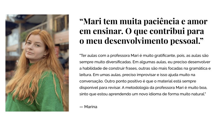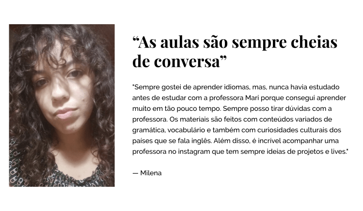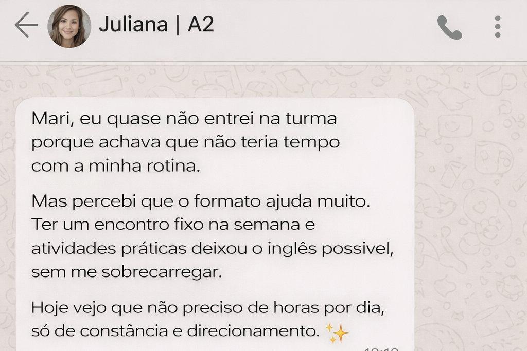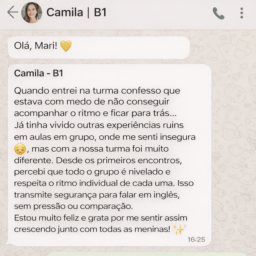 Você participa de aulas ao vivo, em grupo reduzido e organizado por nível, com foco em prática real de conversação. As aulas são para que todas tenham espaço para falar, errar, praticar e ganhar confiança.